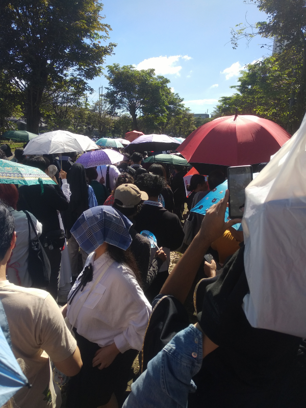 Satrio ternyata ada pre-order takoyaki di salah satu booth. Setelah semuanya udah selesai belanja, kami keluar hall buat makan siang.