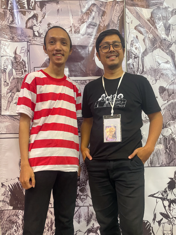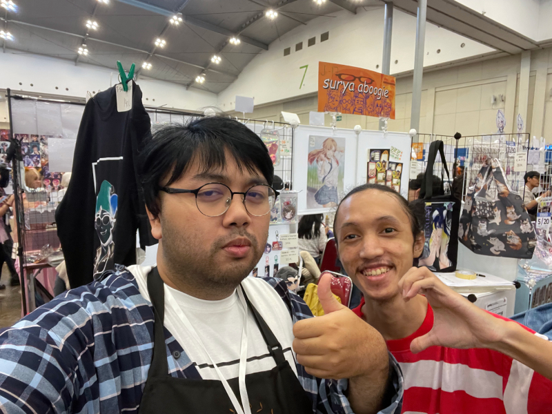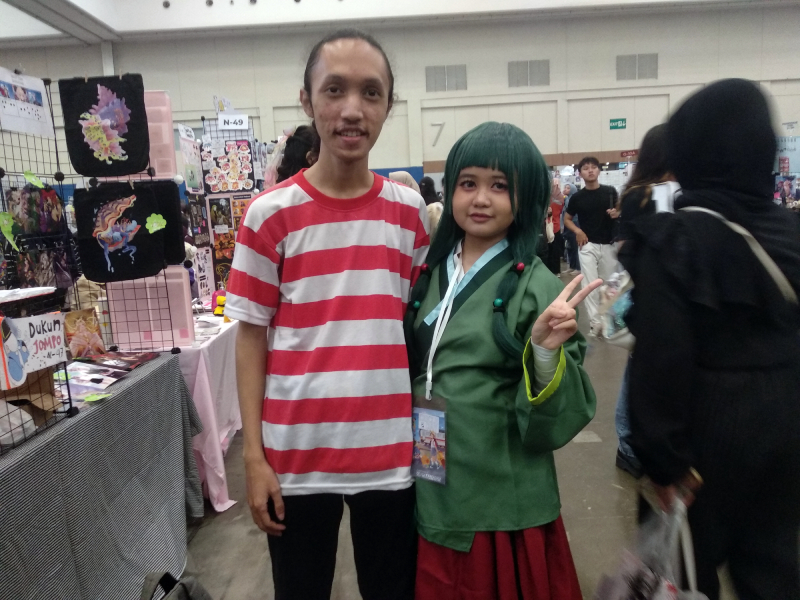 Gue minta rekomendasi barang buat dibeli dari booth dia. Trus akhirnya gue cuma beli stiker doang. Abis itu gue langsung pergi dan lupa buat foto bareng. Tapi kemudian gue balik lagi dan akhirnya foto bareng.